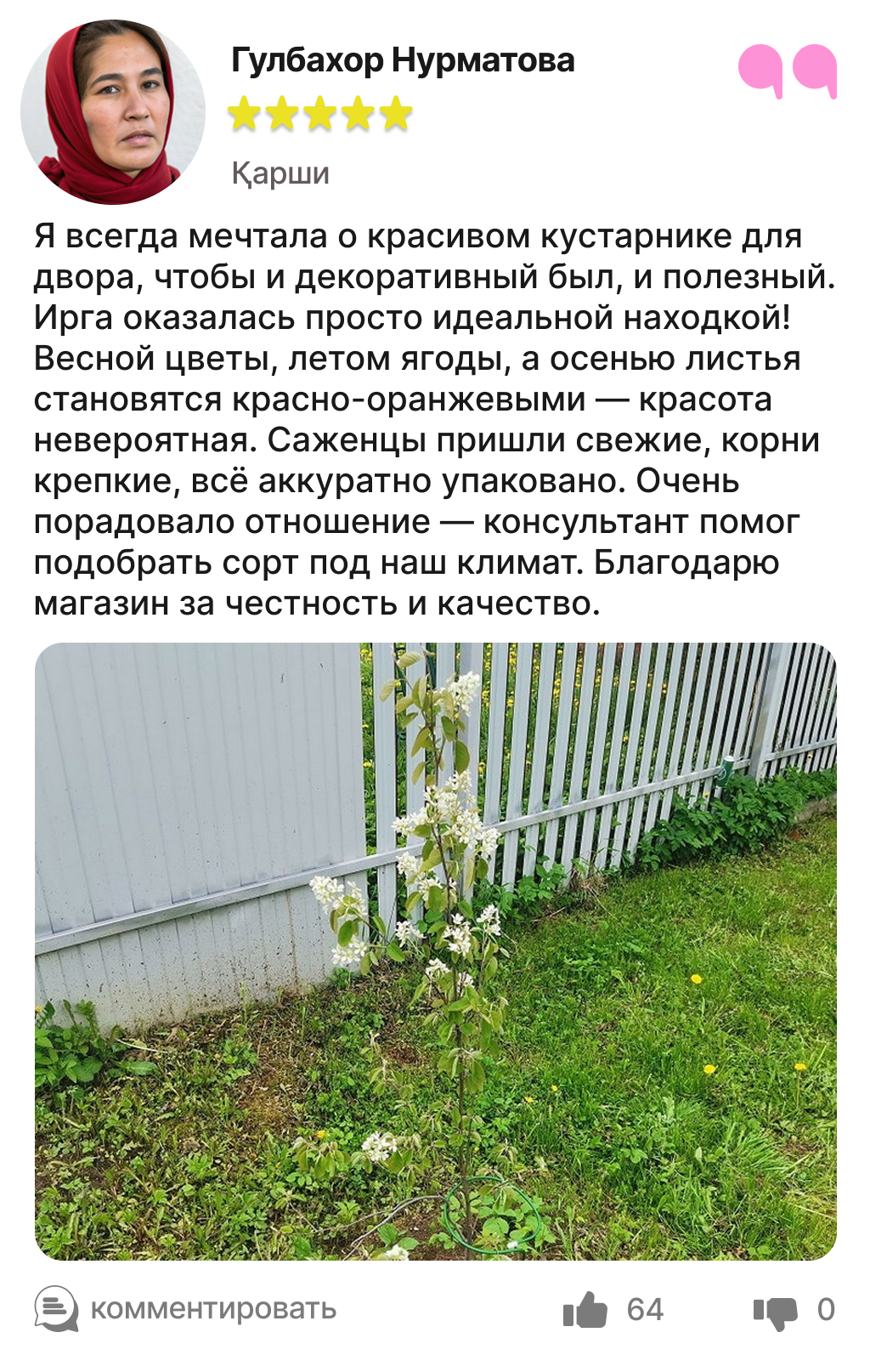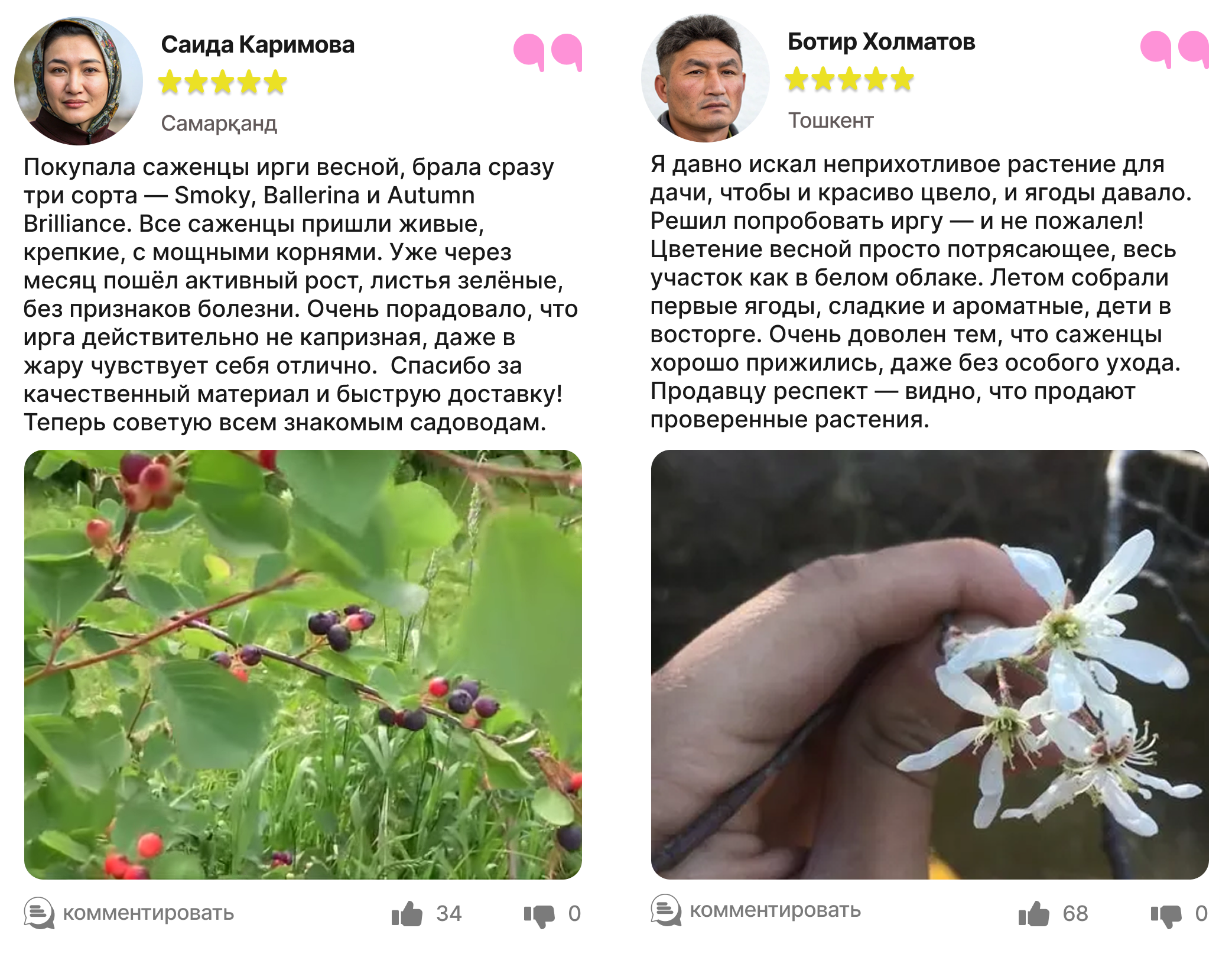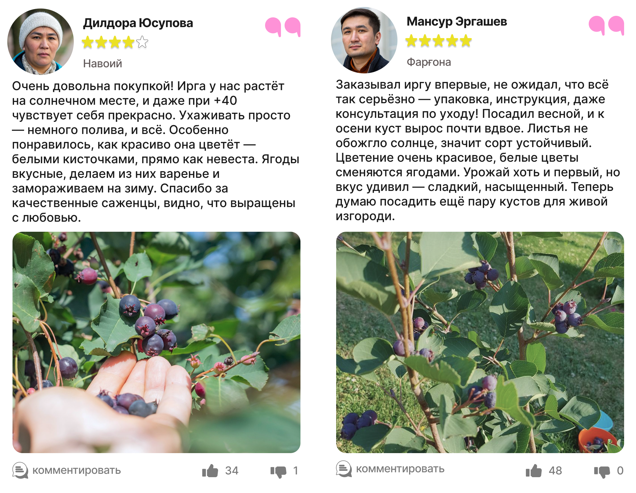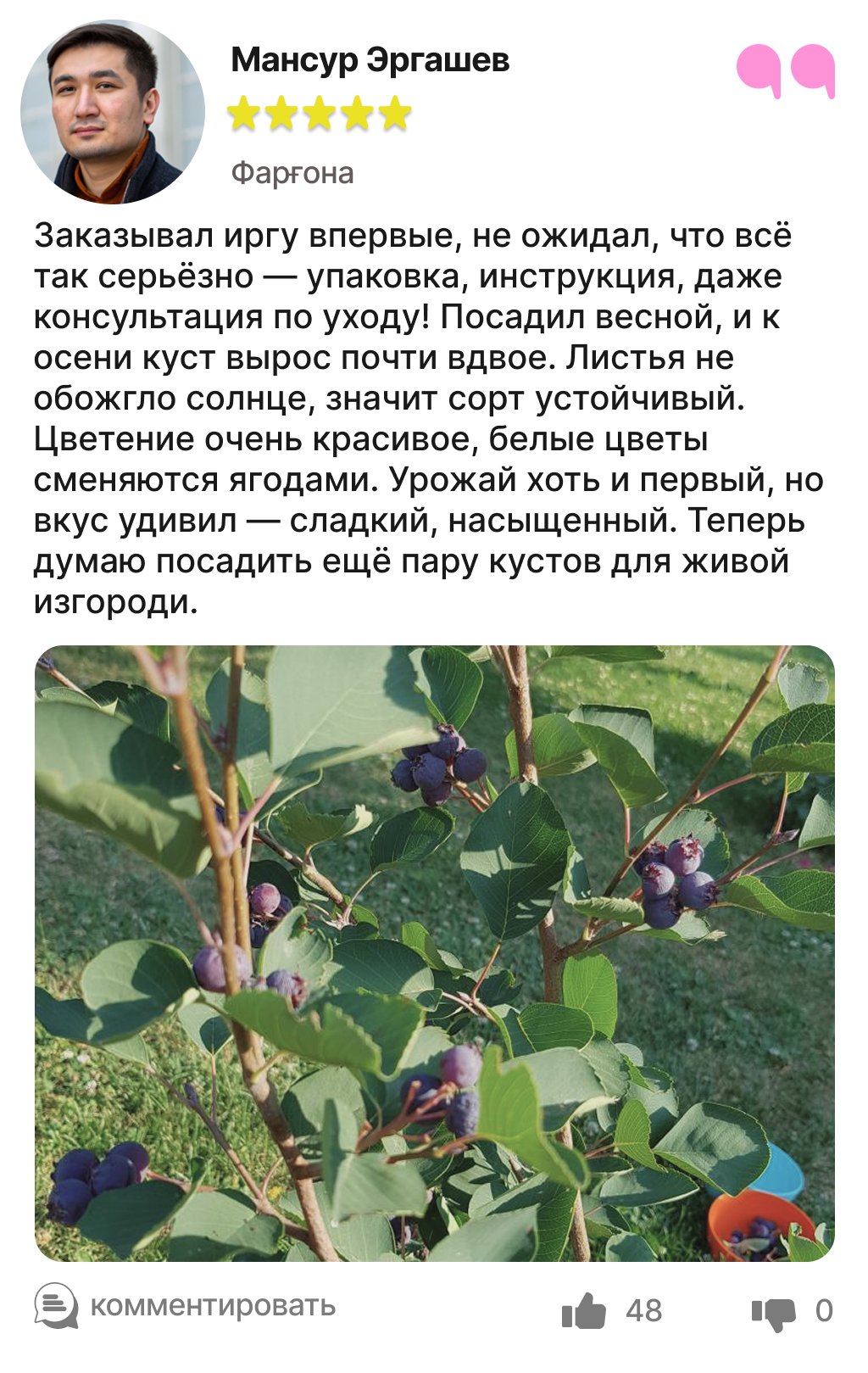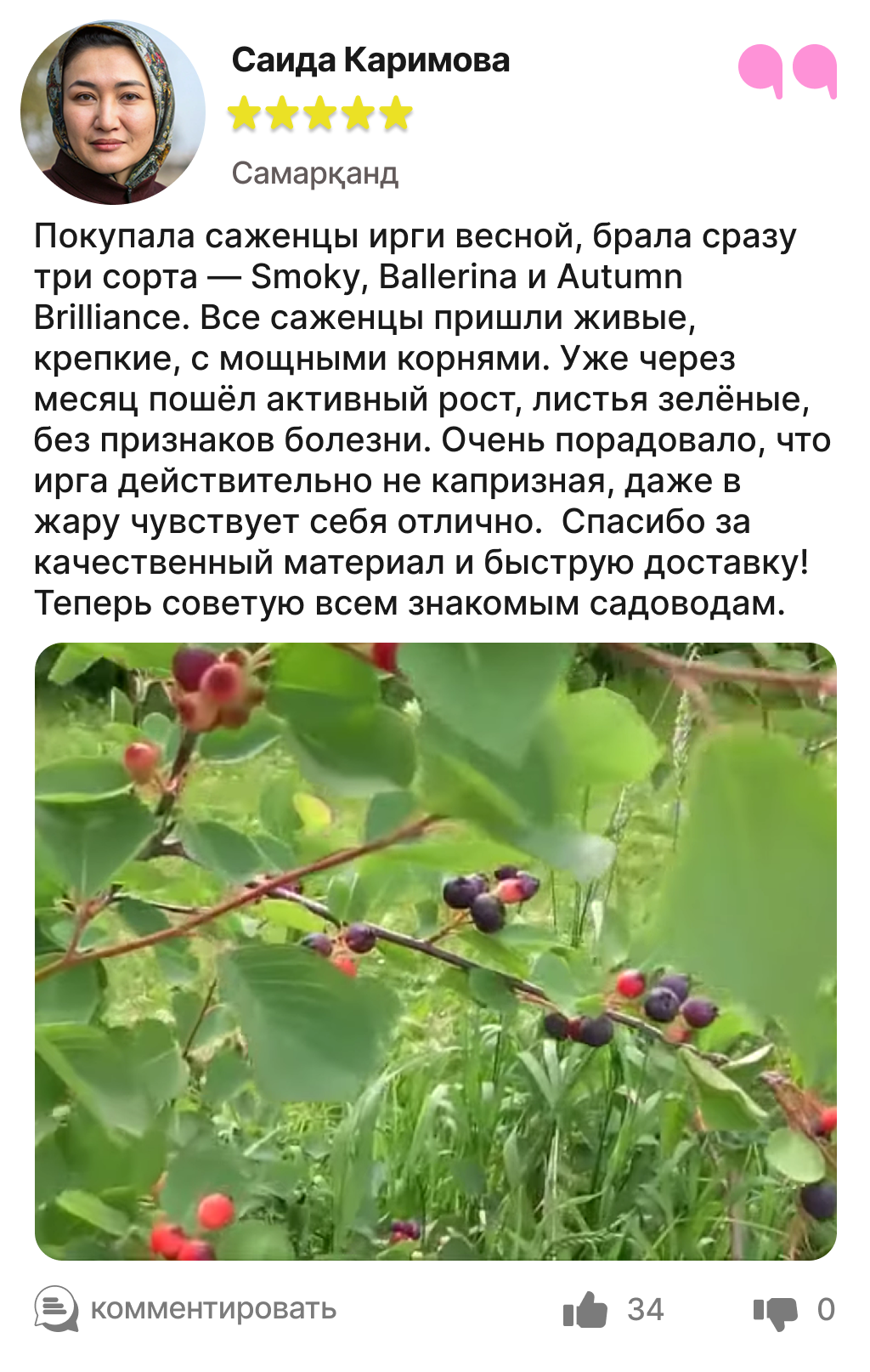 Каждый отзыв — это реальный опыт людей, которые уже посадили и выращивают иргу в своём саду.