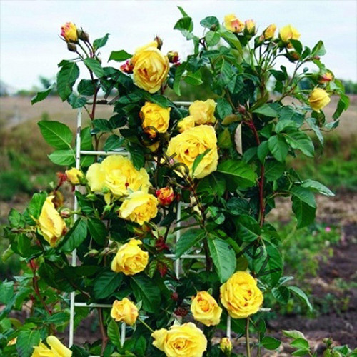 Гуллари катта, 10-11 см ва тўлиқ гуллаганда, майда тўқ сариқ ички гулбаргларнинг массаси қарама-қарши бўлганда яхши кўринади. рангпарроқ ва каттароқлари ташқи билан. Гуллар одатда навбатма-навбат пайдо бўлади, масалан, гибрид чой атиргулларида, биринчи гуллаш пайтида ва флорибундалар каби, иккинчи гуллаш пайтида гуруҳларда. Хушбўй ҳид жуда бой ва мевали. Бута тик, қишга чидамли, катта ялтироқ барглари билан 3-4 м га этади, куртаклари чўзилган ва ўткир. Гуллари лимон-сариқ, чиройли шишасимон, катта (8-9 см), қўш (40 баргли), хушбўй (чой). Гулбарглари кенг, марказга қараб торроқ, якка ёки 3-5 донадан иборат майда тўпгуллар. Барглари қуюқ яшил, жуда порлоқ. Тирноқлари катта. Баландлиги 2 м дан ортиқ буталар. Гуллаш мўл-кўл ва яхши такрорланади.